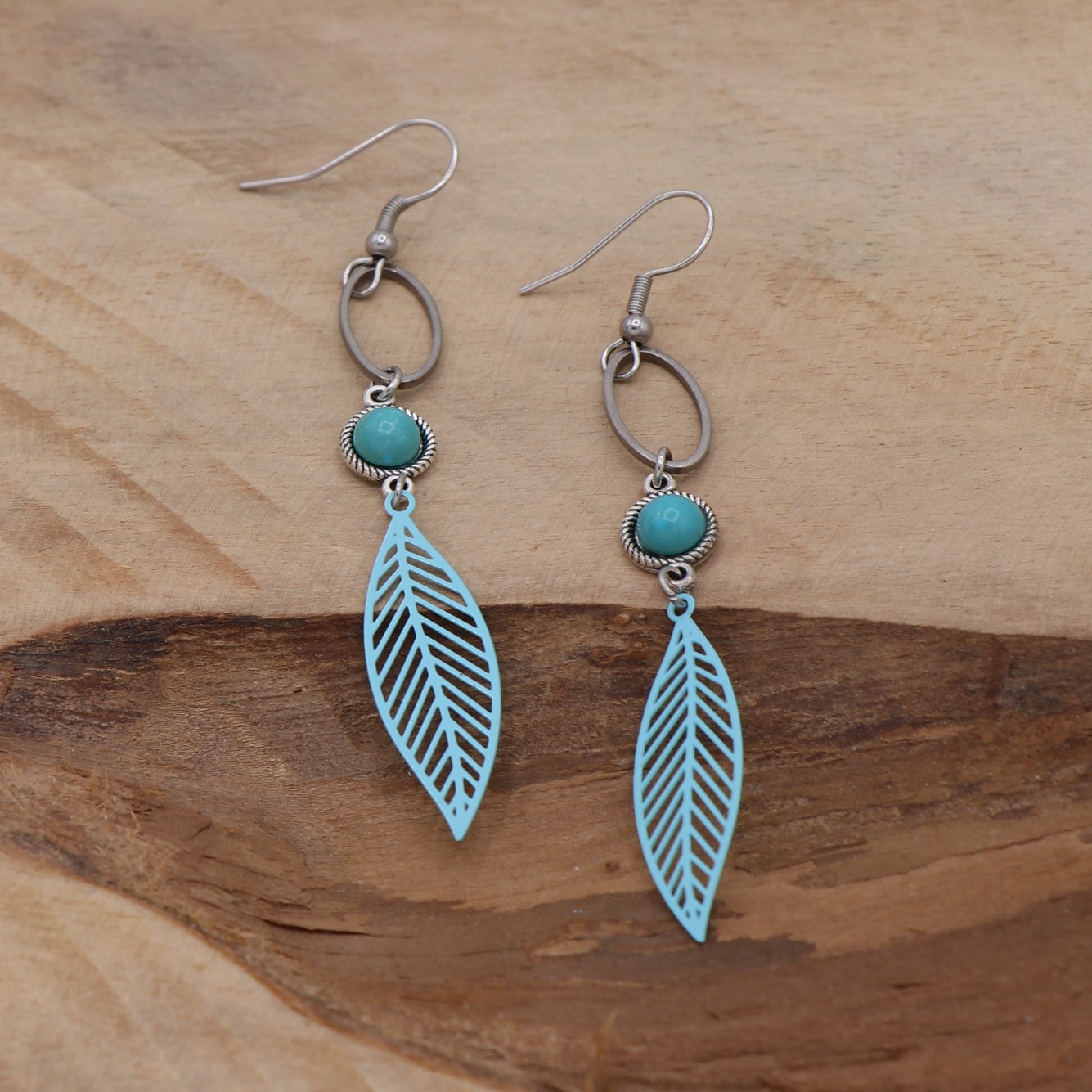 Fleur en estampe bleue, avec son connecteur et sa pierre naturelle incrustée, le tout suspendu à un ovale. L’accroche se fait par des crochets d’oreilles. Garanti sans plomb ni nickel.