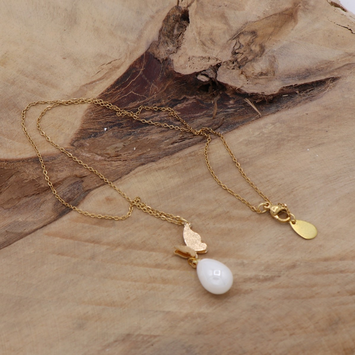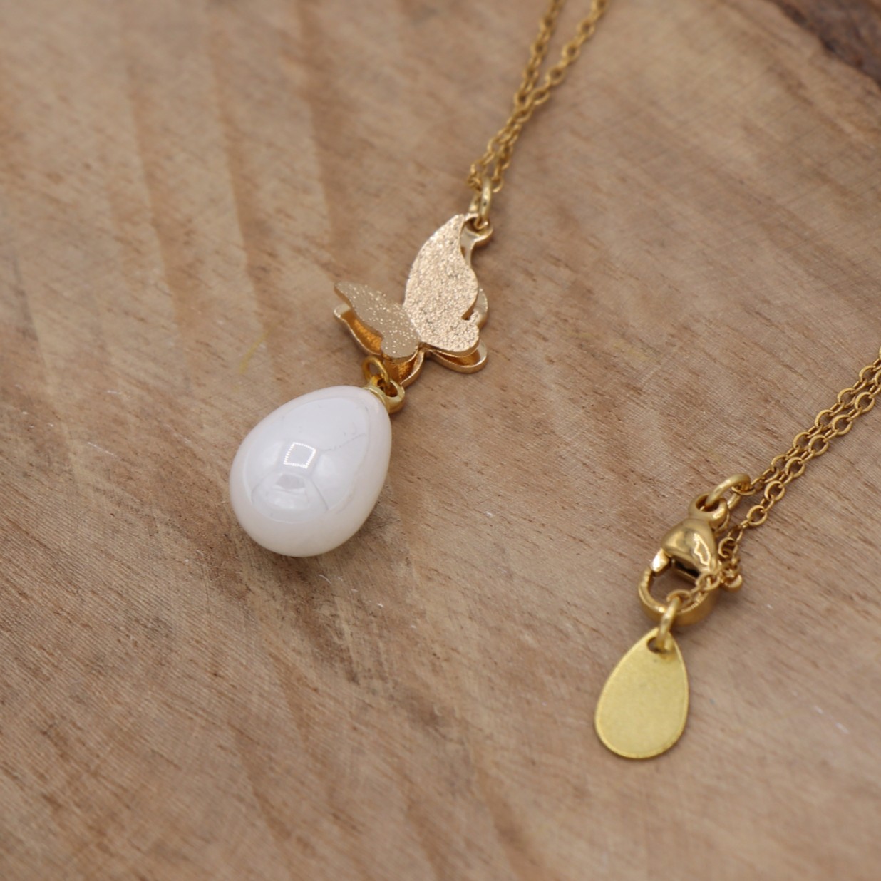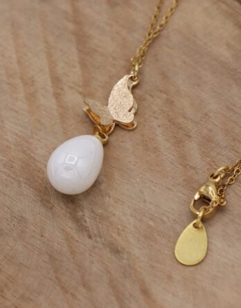 Collier en fine chaîne dorée, avec pendentif papillon et sa perle en acrylique blanche. Garanti sans plomb ni nickel.