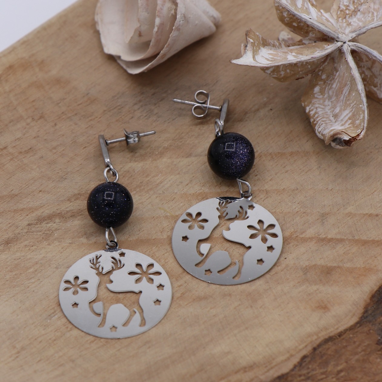 Estampe avec renne de Noël sous les étoiles, surmontée d’une perle bleue nuit scintillante. Accroche par clou d’oreille. Garanti sans plomb ni nickel.