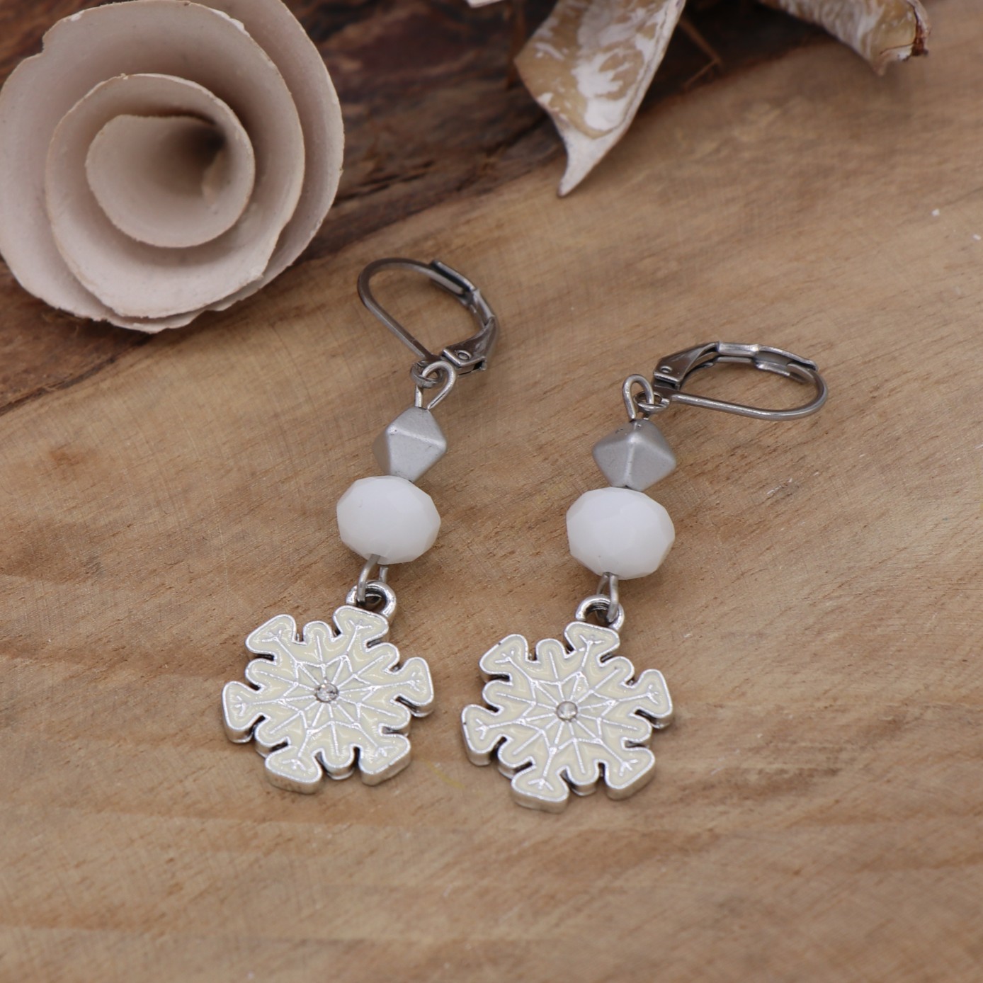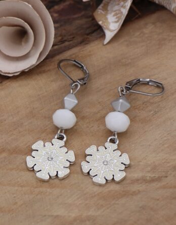 Petit flocon surmonté d’une perle à facette blanche en verre et d’une perle losange grise. Accroche par fermoir type dormeuse. Garanti sans plomb ni nickel.