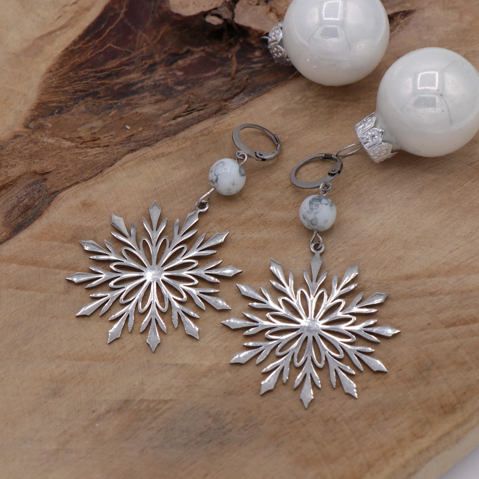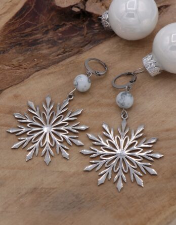 Grand flocon en acier inoxydable et sa perle en verre blanche et grise. L’accroche se fait par des fermoirs type dormeuses. Garanti sans plomb ni nickel.