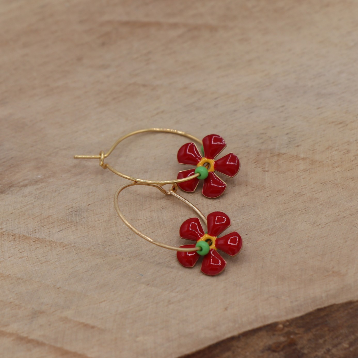 Petite fleur rouge émaillée sur créole accompagnée de deux petites perles de rocailles vertes. Créoles de 2 cm de diamètre. Garanti sans plomb ni nickel.