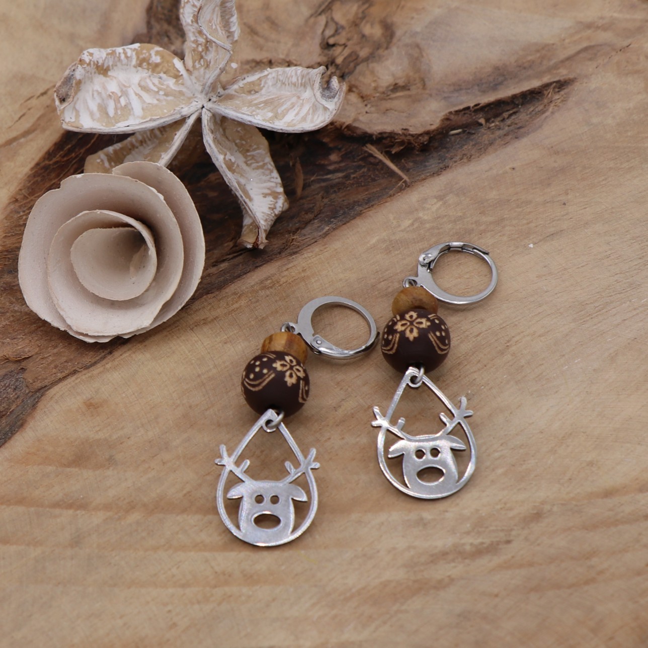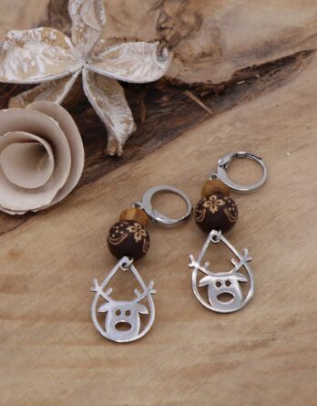 Breloques « renne du Père Noël » argentées et surmontées de perles en bois. Fermoirs type dormeuse. Garanti sans plomb ni nickel.