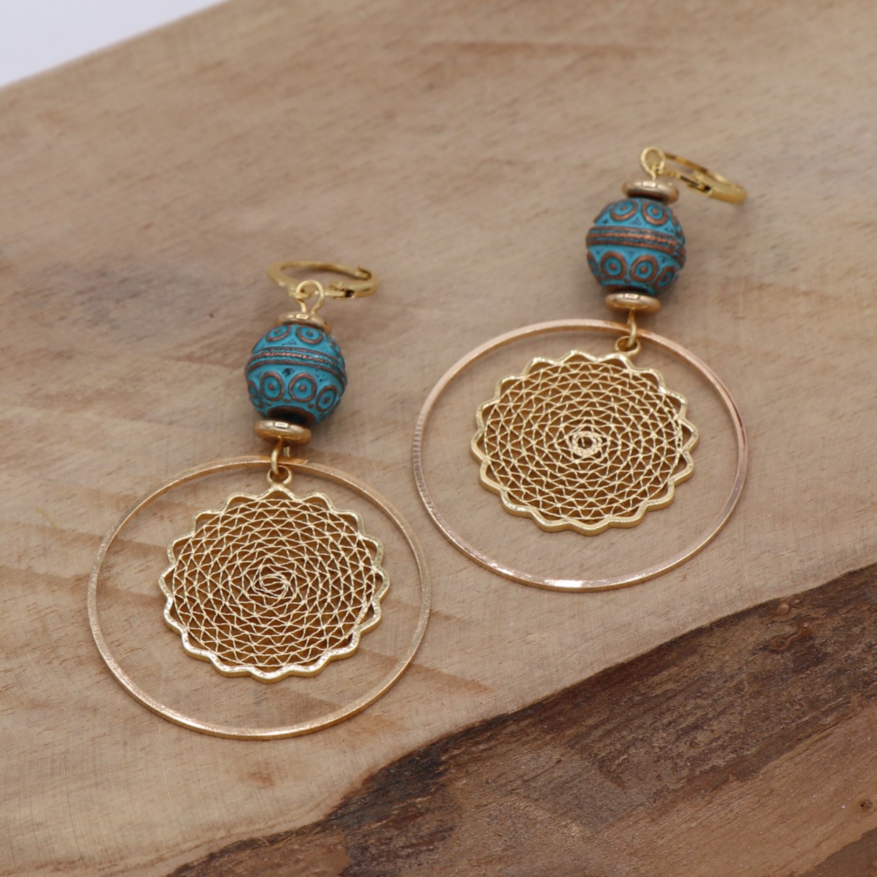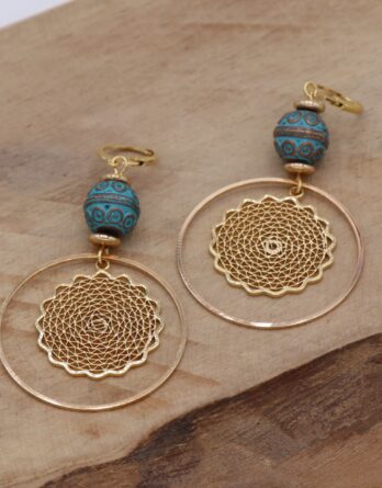 Estampe fleur dans grand anneau doré, surmontée d’une perle en bronze et de deux petites perles d’espacement en forme de disque. L’accroche se fait par un fermoir type dormeuse. Garanti sans plomb ni nickel.