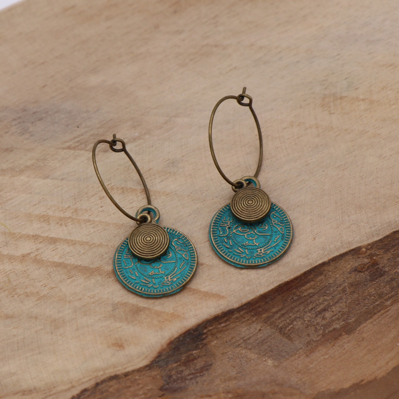 Petit rond en bronze aspect pièce ancienne, sa petite breloque en bronze. Accroche en créoles de 2 cm environ.