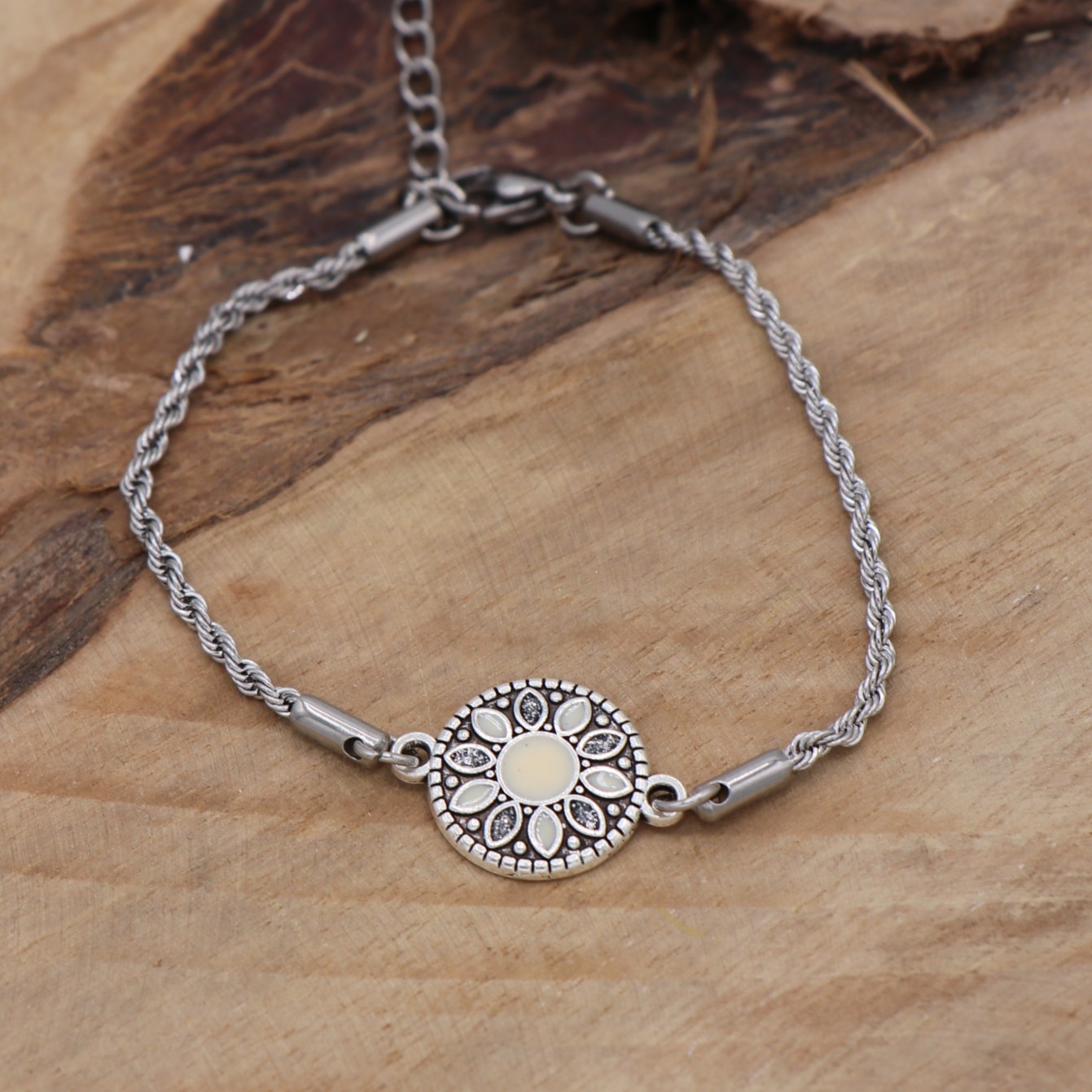 Pastille fleur argentée au cœur blanc. Chainette torsadée.