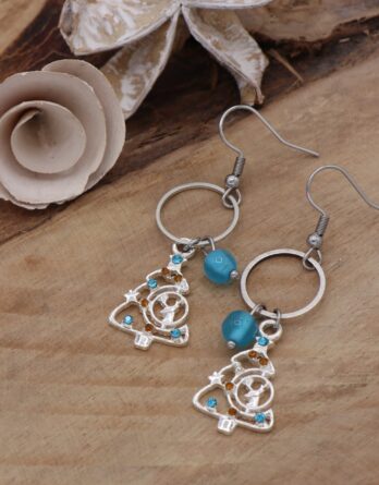 Petit sapin argenté avec petites pierres bleues et dorées incrustées, suspendu à un anneau argenté et accompagné d’une perle acrylique bleue. Accroche par crochet d’oreille. Garanti sans plomb ni nickel.